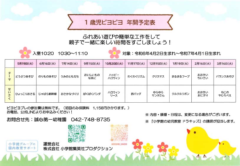 幼稚園入園前のお子様(2歳児)を対象に、親子で楽しく活動しながら集団生活に慣れることをねらいとしています。